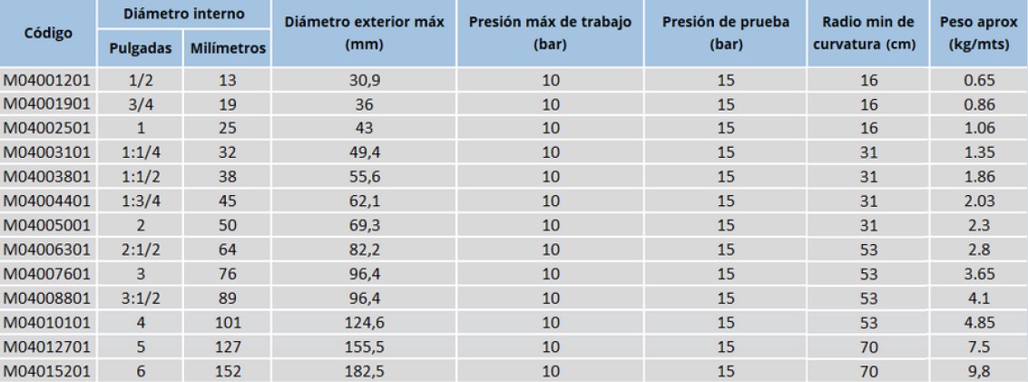 Refuerzos: Fibras sintéticas de alta tenacidad, previamente tratadas y espiral de alambre incorporado, calidad SAE 1080.