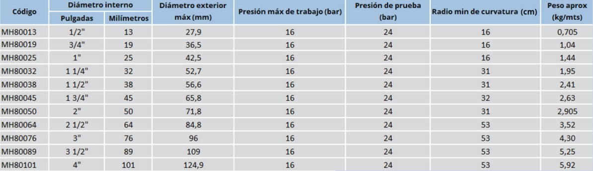 Refuerzos: Fibras sintéticas de alta tenacidad, previamente tratadas y espiral de alambre incorporado, calidad SAE 1070.